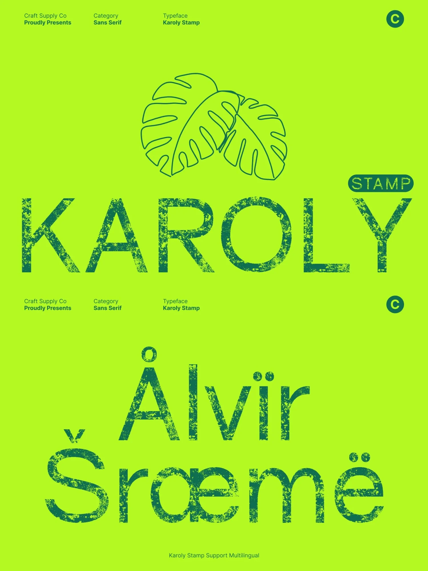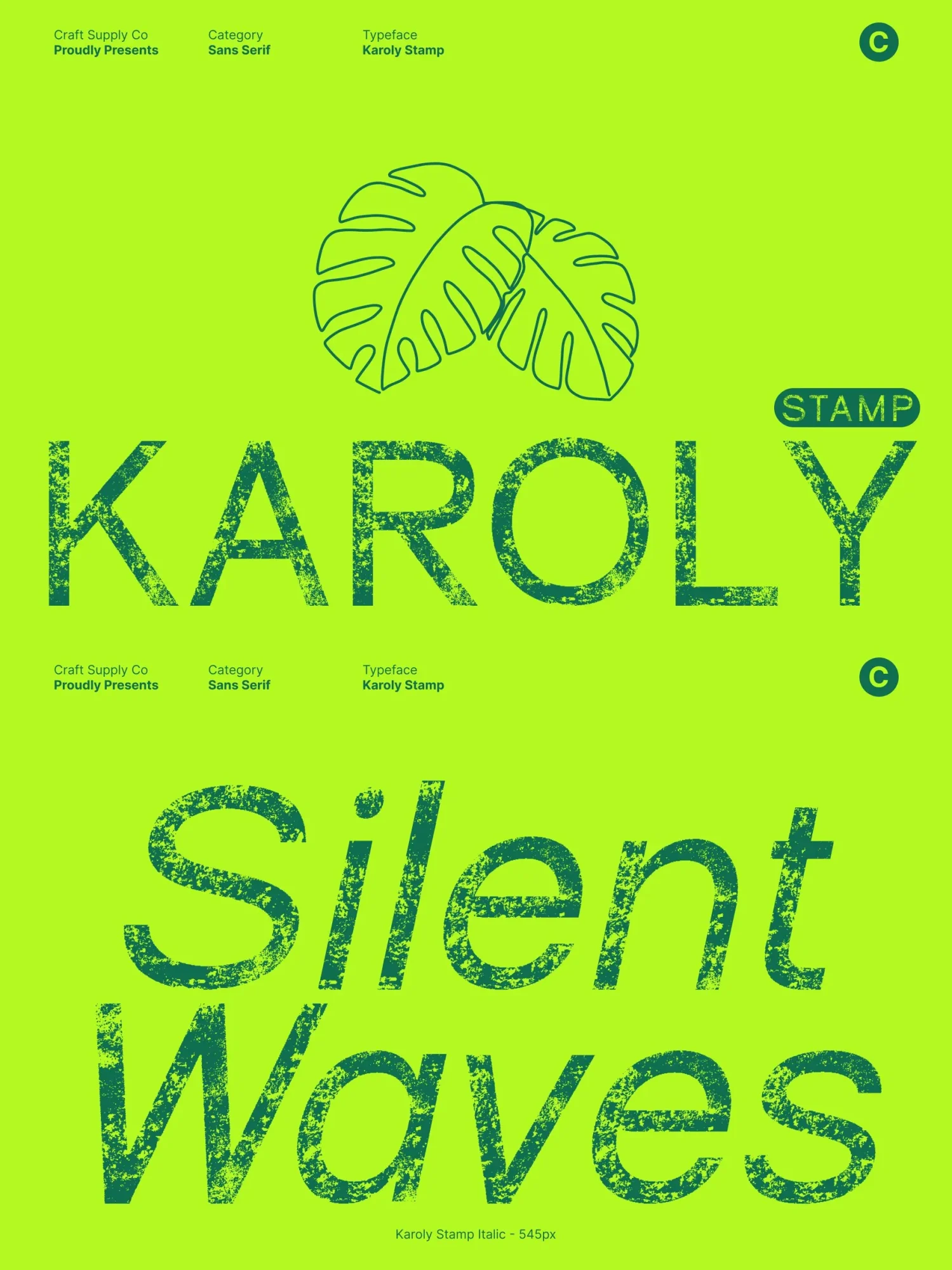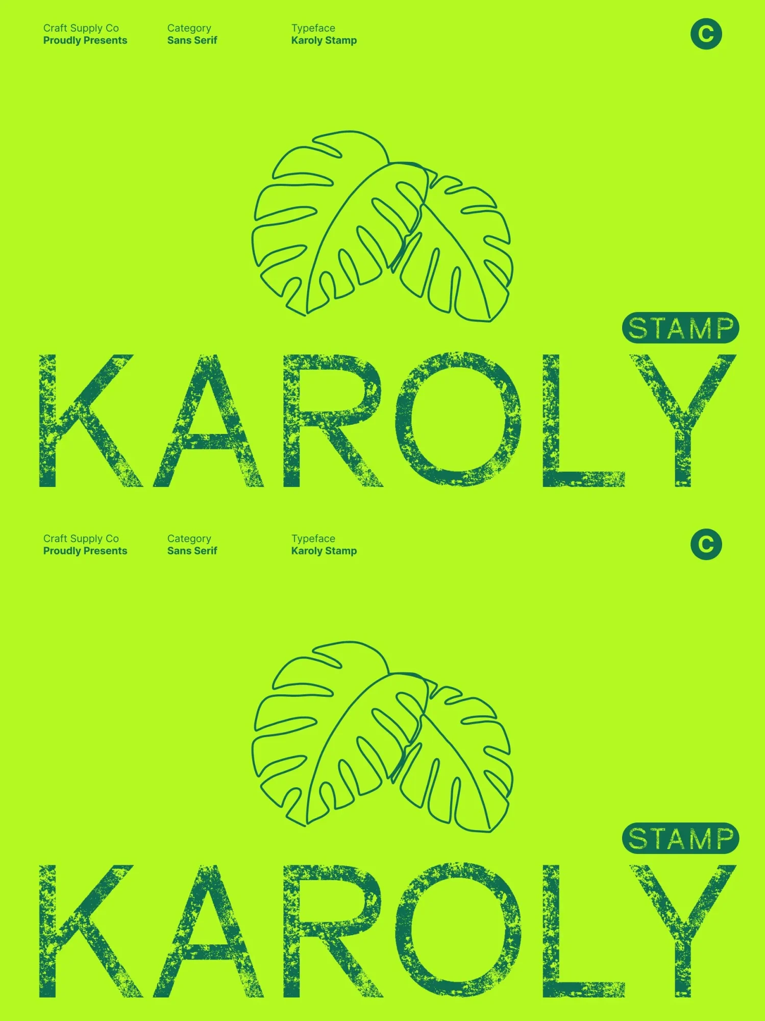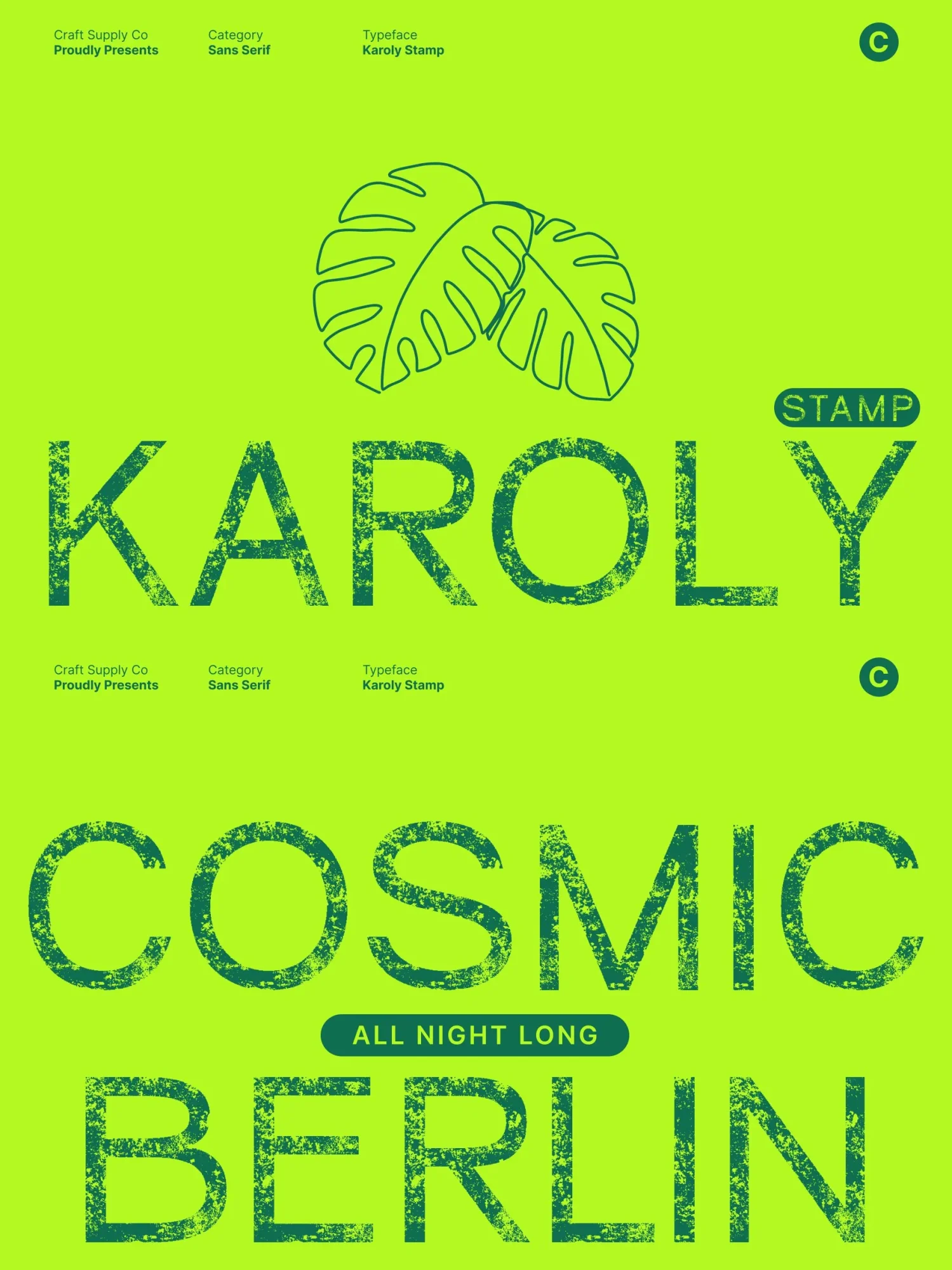 This font excels in display settings, making it perfect for branding, packaging, editorial headers, posters, and logo design. Its clean geometry ensures a strong, contemporary identity, while the stamped texture adds personality, warmth, and visual depth.